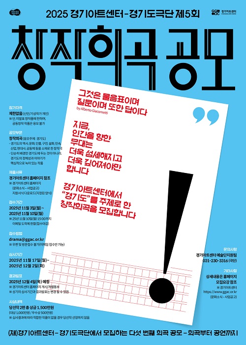 <2025³â Á¦5ȸ âÀÛÈñ°î°ø¸ð>¿¡ ´ëÇÑ ÀÚ¼¼ÇÑ »çÇ×Àº (Àç)°æ±â¾ÆÆ®¼¾ÅÍ È¨ÆäÀÌÁö(http://www.ggac.or.kr)¿¡¼ È®ÀÎ ÇÒ ¼ö ÀÖ´Ù.