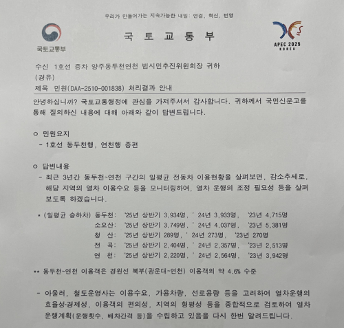 1È£¼± ÁõÂ÷ ¾çÁÖµ¿µÎõ¿¬Ãµ ¹ü½Ã¹ÎÃßÁøÀ§¿øÈ¸(»óÀÓ´ëÇ¥ ÇÑÇöÈ£)´Â 10¿ù27ÀÏ ‘ÁõÂ÷ ¿ä±¸¿¡ ´ëÇÑ ±¹Åä±³ÅëºÎ ȸ½Å¿¡ µû¸¥ Ãß°¡ ÁúÀÇ’¸¦ ÅëÇØ “°æ±âºÏºÎ ½Ã¹ÎµéÀÇ ¿äûÀ» °æÁ¦ÀûÀÎ Àã´ë¸¸ÀÌ ¾Æ´Ï¶ó °ø°øÃ¶µµÀÇ ¿ªÇÒ ¼Ó¿¡¼ °ËÅäÇÑ ´äº¯ÀÌ ³ª¿À±â¸¦ Èñ¸ÁÇÑ´Ù”°í ¹àÇû´Ù.