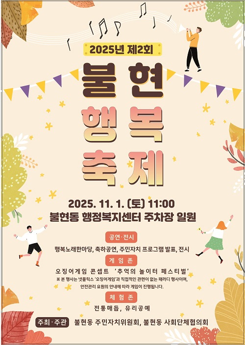 ºÒÇöµ¿ ÁÖ¹ÎÀÚÄ¡À§¿øÈ¸(À§¿øÀå ¹Ú¼øÈ£)´Â ¿À´Â 11¿ù 1ÀÏ(Åä) ºÒÇöµ¿ ÇàÁ¤º¹Áö¼¾ÅÍ ÁÖÂ÷Àå ¹× Àα٠µµ·Î ÀÏ¿ø¿¡¼ Á¦2ȸ ºÒÇöÇູÃàÁ¦¸¦ °³ÃÖÇÑ´Ù°í ¹àÇû´Ù.