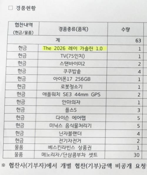 ÀÇÁ¤ºÎ¹®ÈÀç´ÜÀº ÀÌ µ·À¸·Î 2026 ·¹ÀÌ ÀÚµ¿Â÷(1õ816¸¸¿ø), 75ÀÎÄ¡ TV(289¸¸¿ø), ½ºÅĹÙÀ̹Ì2 TV(258¸¸¿ø), Àü±âÀÚÀü°Å(2°³ 270¸¸¿ø), ¾È¸¶ÀÇÀÚ(182¸¸¿ø), ´ÙÀ̽¼ ¿¡¾î·¦(5°³ 279¸¸¿ø), ÄíÄí¹ä¼Ü(4°³ 223¸¸¿ø), ¾ÆÀÌÆù17(129¸¸¿ø) µî 63Á¡À» ¸¶·ÃÇß´Ù.