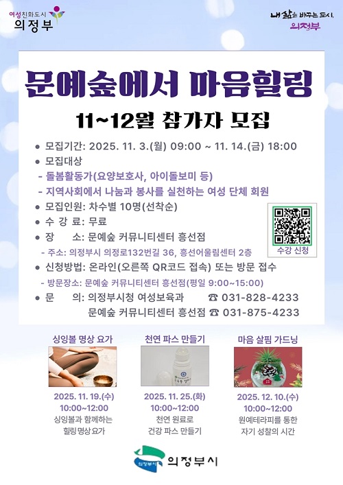 ÀÇÁ¤ºÎ½Ã(½ÃÀå ±èµ¿±Ù)´Â 11¿ù 3ÀÏ ¿ÀÀü 9½ÃºÎÅÍ ¹®¿¹½£ Ä¿¹Â´ÏƼ¼¾ÅÍ Èï¼±Á¡ ÇÁ·Î±×·¥ ‘¹®¿¹½£¿¡¼ ¸¶À½Èú¸µ’ÀÇ 11~12¿ù Âü°¡ÀÚ¸¦ ¸ðÁýÇÑ´Ù.