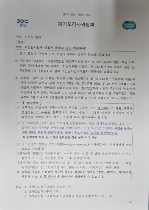 ÀÇÁ¤ºÎ°æÀüö Áֹ਻çû±¸´Ü(°øµ¿´ëÇ¥ ÀÓ±ÙÀç·ÀÌÁø¼±)Àº 11¿ù4ÀÏ º¸µµÀڷḦ ÅëÇØ “°æ±âµµ °¨»çÀ§¿øÈ¸°¡ 2025³â 10¿ù27ÀÏ ÇØ´ç û±¸¸¦ Á¢¼öÇÏ°í ´ëÇ¥ÀÚ Áõ¸í¼¸¦ ¹ß±ÞÇß´Ù”¸ç “ÀÌ¿¡ µû¶ó ½Ã¹ÎµéÀÇ ¼¸í ÀýÂ÷°¡ 2026³â 1¿ù25ÀϱîÁö ÁøÇàµÈ´Ù”°í ¹àÇû´Ù.
