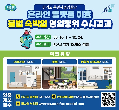 °æ±âµµ Ưº°»ç¹ý°æÂû´ÜÀº 10¿ù 1ÀϺÎÅÍ 24ÀϱîÁö °í¾ç, ºÎõ, ¼º³², ȼº, ¾È¾ç, ±èÆ÷, ¿ëÀÎ, ÆÄÁÖ µî 8°³ Áö¿ª¿¡¼ ºÒ¹ý¿µ¾÷À¸·Î ÀǽɵǴ ¼÷¹Ú¾÷¼Ò¿¡ ´ëÇÑ ´Ü¼ÓÀ» ¹ú¿© ¹Ì½Å°í ¿µ¾÷ 13°÷ 25°³ °´½ÇÀ» Àû¹ßÇß´Ù°í 11ÀÏ ¹àÇû´Ù.