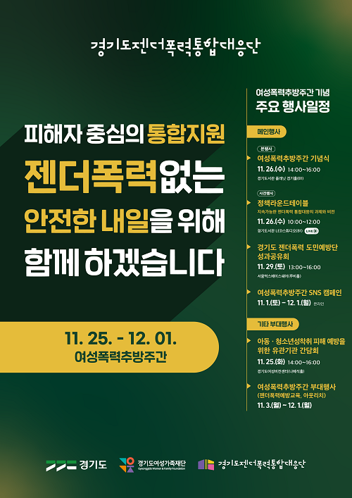¶ÇÇÑ 11¿ù ÇÑ ´Þ°£ ‘Á¨´õÆø·Â ¾ø´Â ³»ÀÏÀ» À§ÇÑ 1,000ÀÎ Èñ¸Á 縰Áö’ ´©¸®¼ÒÅë¸Á(SNS) Ä·ÆäÀÎÀ» ÁøÇàÇϰí ÀÖÀ¸¸ç, µµ³» °¢ ±â°üÀÌ ÃßÁøÇÏ´Â ÁÖ¿ä Çà»ç¸¦ ÇÑ´«¿¡ º¼ ¼ö ÀÖ´Â ‘°æ±âµµ ¿©¼ºÆø·ÂÃß¹æÁÖ°£ Çà»ç ¾È³»Áöµµ’¸¦ Á¦ÀÛ·°ø°³ÇÒ ¿¹Á¤ÀÌ´Ù.