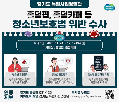 °æ±âµµ´Â 11¿ù 24ÀϺÎÅÍ 12¿ù 12ÀϱîÁö 3ÁÖ°£ µµ³» Ȧ´ýÆà, Ȧ´ýÄ«Æä¸¦ ´ë»óÀ¸·Î û¼Ò³âÀÇ ÃâÀÔ·°í¿ë µî ºÒ¹ýÇàÀ§¸¦ ÁýÁß ¼ö»çÇÑ´Ù.