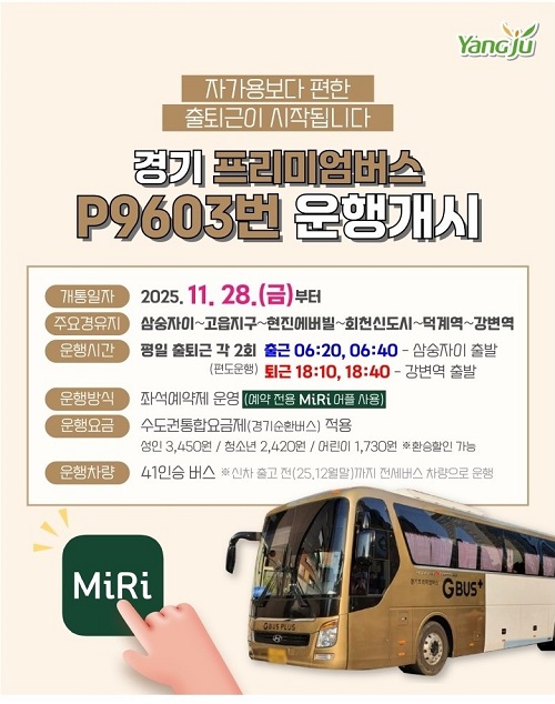 °æ±â ÇÁ¸®¹Ì¾ö¹ö½º P9603¹øÀº ´ëÁß±³Åë ¼ö¿ä°¡ ÁýÁߵǴ ÆòÀÏ Ãâ±Ù ½Ã°£´ë¿¡ »ï¼þÀÚÀÌ¾ÆÆÄÆ®¿¡¼ °º¯¿ª ¹æ¸éÀ¸·Î 6½Ã 20ºÐ°ú 6½Ã 40ºÐ µÎ Â÷·Ê ¿îÇàµÇ¸ç, Åð±Ù ½Ã°£´ë¿¡´Â °º¯¿ª¿¡¼ ¾çÁÖ ¹æ¸éÀ¸·Î 18½Ã 10ºÐ°ú 18½Ã 40ºÐ µÎ Â÷·Ê ¿îÇàµÈ´Ù. ÀÌ ³ë¼±Àº Á¼® ¿¹¾àÁ¦ ¹æ½ÄÀ¸·Î ¿î¿µµÇ¸ç, ‘¹Ì¸®(MiRi) ¾Û’ »çÀü ¿¹¾à ÈÄ ÀÌ¿ëÇÒ ¼ö ÀÖ´Ù.