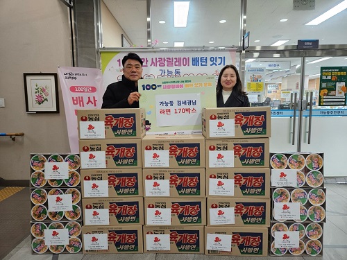 ÀÇÁ¤ºÎ½Ã °¡´Éµ¿Áֹμ¾ÅÍ(µ¿Àå ¹èÀº°æ)´Â 12¿ù 9ÀÏ °¡´Éµ¿ ÁÖ¹ÎÀÚġȸ ±è¼¼°æ À§¿øÀÌ °ü³» Ãë¾à°èÃþ Áö¿øÀ» À§ÇØ ¶ó¸é 170»óÀÚ¸¦ ±âŹÇÏ¸ç ‘100Àϰ£ »ç¶û¸±·¹ÀÌ ¹èÅÏ ÀձⒿ¡ µ¿ÂüÇß´Ù°í ¹àÇû´Ù.