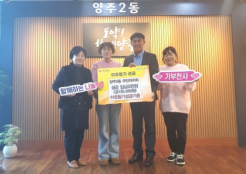 ¾çÁÖ2µ¿(µ¿Àå ¹é±âö)Àº Áö³ÇØ 12¿ù 31ÀÏ ¾çÁÖ2µ¿ ÁÖ¹ÎÀÚġȸ(ȸÀå ±èÈñÀº)¿¡¼ ÀÌ¿ôµ½±â ¼º±Ý 15¸¸ ¿øÀ» ±âºÎÇß´Ù°í ¹àÇû´Ù.