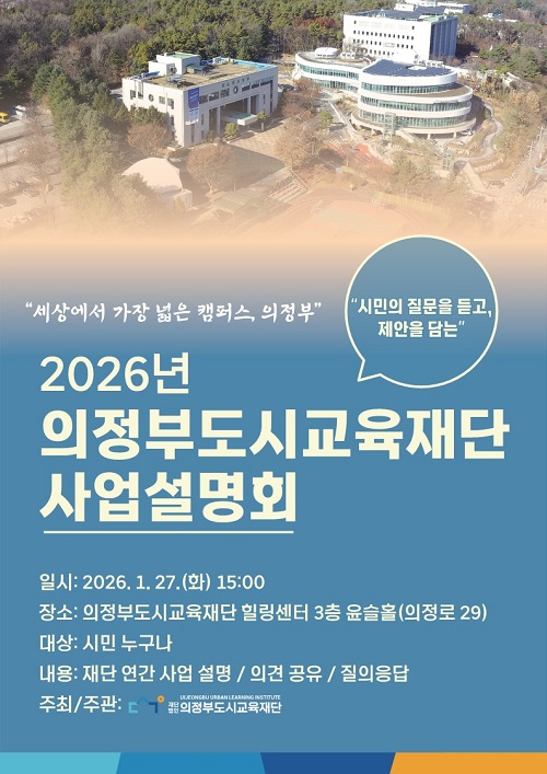 ÀÇÁ¤ºÎµµ½Ã±³À°Àç´Ü(´ëÇ¥ÀÌ»ç À̼º)Àº 1¿ù 27ÀÏ ¿ÀÈÄ 3½Ã Àç´ÜÀÇ ¿¬°£ »ç¾÷ ¹æÇâÀ» ½Ã¹Îµé°ú °øÀ¯Çϰí ÀǰßÀ» ³ª´©±â À§ÇÑ '2026³â ÀÇÁ¤ºÎµµ½Ã±³À°Àç´Ü »ç¾÷¼³¸íȸ'¸¦ °³ÃÖÇÑ´Ù.