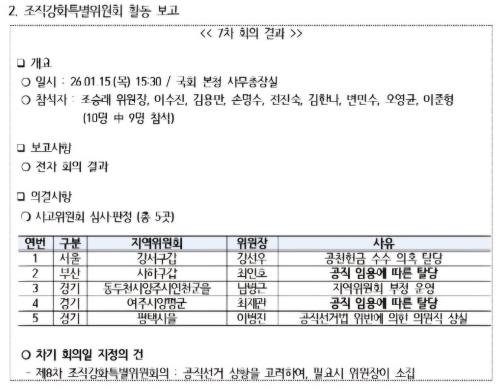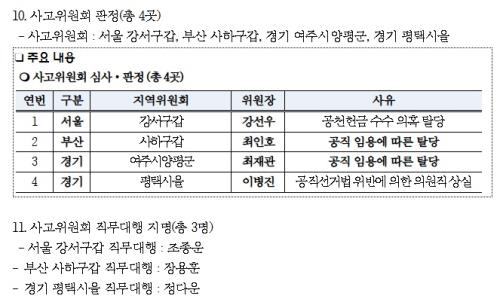 ¡ã¼¿ï °¼°© °¼±¿ì(°øÃµÇå±Ý ¼ö¼öÀÇȤ Å»´ç) ¡ãºÎ»ê »çÇϰ© ÃÖÀÎÈ£(°øÁ÷ ÀÓ¿ë¿¡ µû¸¥ Å»´ç) ¡ã°æ±â ¿©ÁÖ·¾çÆò ÃÖÀç°ü(°øÁ÷ ÀÓ¿ë¿¡ µû¸¥ Å»´ç) ¡ã°æ±â ÆòÅÃÀ» À̺´Áø(°øÁ÷¼±°Å¹ý À§¹Ý¿¡ ÀÇÇÑ ÀÇ¿øÁ÷ »ó½Ç)°ú ÇÔ²² ³²º´±Ù À§¿øÀåÀÇ ‘Áö¿ªÀ§¿øÈ¸ ºÎÁ¤ ¿î¿µ’ »çÀ¯°¡ ¸í½ÃµÆ´Ù.