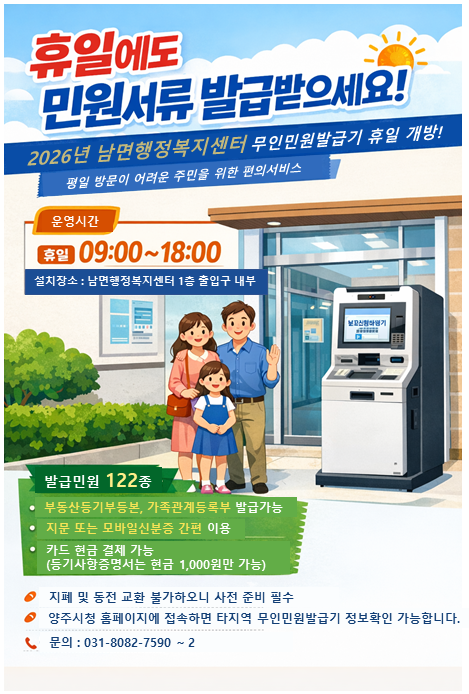 ¾çÁֽà ³²¸é ÇàÁ¤º¹Áö¼¾ÅÍ´Â ÇàÁ¤º¹Áö¼¾ÅÍ ³»¿¡ ¼³Ä¡µÈ ¹«Àιοø¹ß±Þ±â ¿î¿µÀÏÀ» ±âÁ¸ ÆòÀÏ¿¡¼ ÈÞÀϱîÁö È®´ëÇØ Áö³ 1¿ù 17ÀϺÎÅÍ ¿î¿µÀ» ½ÃÀÛÇß´Ù°í ¹àÇû´Ù.
