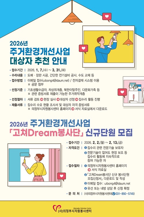 ÀÇÁ¤ºÎ½ÃÀÚ¿øºÀ»ç¼¾ÅÍ(ÀÌ»çÀå ÀÌ¿ë°É)´Â ÁÖ°Å Ãë¾à°èÃþÀÇ ¾ÈÀüÇϰí ÄèÀûÇÑ ÁÖ°Åȯ°æ Á¶¼ºÀ» À§ÇØ ¿î¿µ ÁßÀÎ '°íÃÄDreamºÀ»ç´Ü'ÀÇ ½Å±Ô´Ü¿øÀ» ¸ðÁýÇÑ´Ù.