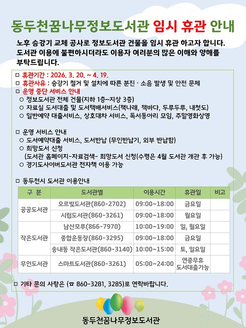 ÇÑÆí ½Â°±â ±³Ã¼ °ø»ç ¹× ÈÞ°ü ±â°£ Áß µµ¼°ü ¼ºñ½º ¿î¿µ°ú °ü·ÃÇÑ ÀÚ¼¼ÇÑ »çÇ×Àº ²Þ³ª¹«Á¤º¸µµ¼°ü ´©¸®Áý(lib.ddc.go.kr) ¶Ç´Â ¿î¿µ½Ç(860-3281)·Î ¹®ÀÇÇÏ¸é µÈ´Ù.
