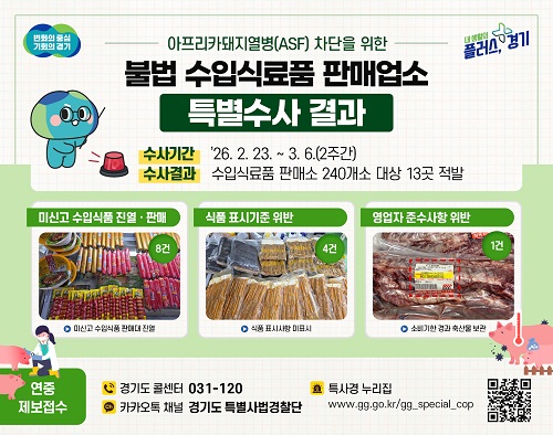 ±Ç¹®ÁÖ °æ±âµµ Ưº°»ç¹ý°æÂû´ÜÀåÀº “ASF ¹ÙÀÌ·¯½º À¯ÀÔ °æ·Î°¡ µÉ ¼ö ÀÖ´Â ºÒ¹ý ¼öÀÔ µ·°¡°øÇ° µîÀº ¾çµ· ³ó°¡¿¡ Ä¡¸íÀûÀÎ À§ÇùÀÌ µÉ ¼ö ÀÖ°í ¾Ë·¹¸£±â Ç¥½ÃÁ¤º¸ µîµµ ¾ø¾î µµ¹Î °Ç°¿¡µµ ½É°¢ÇÑ ÇÇÇØ¸¦ ÁÙ ¼ö ÀÖ´Ù”¸ç ºÒ¹ý ¼öÀÔ½Äǰ ÆÇ¸Å ÇàÀ§°¡ ±ÙÀýµÉ ¼ö ÀÖµµ·Ï ÃÖ¼±¿¡ ³ë·ÂÀ» ´ÙÇϰڴٓ°í ¸»Çß´Ù.