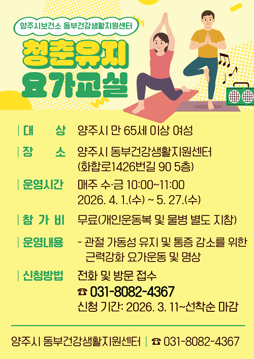 ¾çÁֽà °ü°èÀÚ´Â “¿ä°¡¿Í ±Ù·Â ¿îµ¿À» ÅëÇØ °üÀý¿° ¿¹¹æ°ú ÇÔ²² ±Ù·Â, À¯¿¬¼º, ±ÕÇü°¨°¢ Çâ»ó¿¡ µµ¿òÀÌ µÇ±æ ±â´ëÇÑ´Ù”¸ç “¾ÕÀ¸·Îµµ ½Ã¹Î °Ç° ÁõÁøÀ» À§ÇÑ ´Ù¾çÇÑ ÇÁ·Î±×·¥À» ¿î¿µÇØ ³ª°¡°Ú´Ù”°í ¸»Çß´Ù.