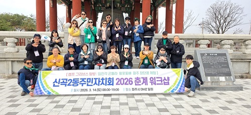 ÀÇÁ¤ºÎ½Ã ½Å°î2µ¿Áֹμ¾ÅÍ(µ¿Àå ÀÌ»óÇö)´Â 3¿ù 14ÀÏ ½Å°î2µ¿ ÁÖ¹ÎÀÚġȸ(ȸÀå Çö¿ë»ê)°¡ ÆÄÁֽà DMZ ÀÏ¿ø¿¡¼ ÁÖ¹ÎÀÚġȸ À§¿ø°ú °ü°èÀÚ µî 25¸íÀÌ Âü¼®ÇÑ °¡¿îµ¥ 2026³â Ãá°è ¿öÅ©¼óÀ» ÁøÇàÇß´Ù°í ¹àÇû´Ù.