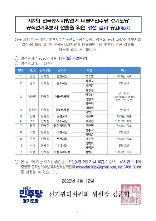 ´õºÒ¾î¹ÎÁÖ´ç °æ±âµµ´ç ¼±°Å°ü¸®À§¿øÈ¸´Â 4¿ù12ÀÏ µ¿µÎõ½ÃÀå Èĺ¸ °øÃµÀ» À§ÇÑ °á¼±¿¡ ¹ÚÅÂÈñ, ÀÌÀÎ±Ô ¿¹ºñÈ帰¡ ÁøÃâÇß´Ù°í °øÁöÇß´Ù.