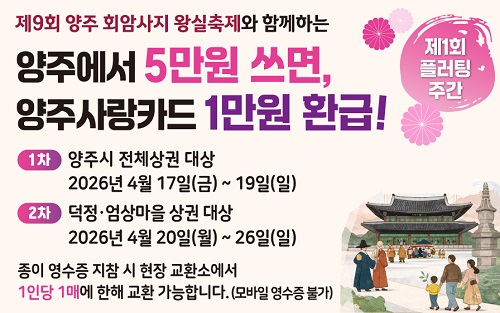 À̹ø ‘2026³â Á¦1ȸ Ç÷¯ÆÃ ÁÖ°£’Àº 4¿ù 17ÀϺÎÅÍ 19ÀϱîÁö ÁøÇàµÈ´Ù. ¾çÁֽà Àü¿ª ¶Ç´Â ¿Õ½ÇÃàÁ¦ Çà»çÀå ³»¿¡¼­ ¼ÒºñÇÑ ¿µ¼öÁõÀ» Çà»çÀå ³» ±³È¯¼Ò¿¡ Á¦ÃâÇϸé, °áÁ¦ ±Ý¾×ÀÇ 20%(1Àδç ÃÖ´ë 1¸¸ ¿ø)¸¦ ¾çÁÖ»ç¶ûÄ«µå·Î ÇöÀå¿¡¼­ ȯ±ÞÇØ ÁÖ´Â ¹æ½ÄÀ¸·Î ÁøÇàµÈ´Ù. ´Ü, ÇÕ»ê±Ý¾×ÀÌ 5¸¸ ¿ø ÀÌ»óÀÎ °æ¿ì¿¡ ÇÑÇØ Áö±ÞµÇ¸ç, ÁغñµÈ ¿¹»ê ¼ÒÁø ½Ã Á¶±â Á¾·áµÉ ¼ö ÀÖ´Ù.