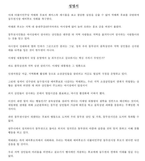 µ¿µÎõ Å«½ÃÀå»óÀÎȸ, ½Å½Ã°¡Áö»óÀÎȸ, À¯Èï»óÀÎȸ, ÀÚµ¿Â÷»óÀÎȸ ¼Ò¼Ó 200¿©¸íÀÌ ³Ñ´Â »óÀεéÀº 4¿ù16ÀÏ ¼º¸í¼­¸¦ ¹ßÇ¥ÇÏ°í “¾îÁ¦ ¹ÎÁÖ´ç ¹ÚÅÂÈñ Èĺ¸ÀÇ ÆäÀ̽ººÏ °Ô½Ã¹°À» º¸°í Âü´ãÇÑ ½ÉÁ¤À» °¨Ãâ ¼ö ¾ø¾î ±ÔźÇÏ¸ç ¿¹ºñÈĺ¸ »çÅ𸦠Ã˱¸ÇÑ´Ù”°í Çß´Ù.