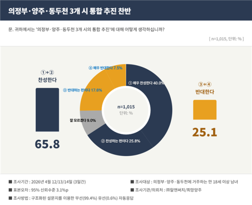 ¿©·ÐÁ¶»ç Àü¹®±â°ü ¢ß¾Ë¾Ø½áÄ¡°¡ ‘Èñ¸Á¾çÁÖ’ ÀÇ·Ú·Î Áö³­ 4¿ù12~14ÀÏ ÀÇÁ¤ºÎ·¾çÁÖ·µ¿µÎõ °ÅÁÖ ¸¸ 18¼¼ ÀÌ»ó ³²³à 1,015¸íÀ» ´ë»óÀ¸·Î ½Ç½ÃÇÑ ¿©·ÐÁ¶»ç °á°ú, ‘ÀÇÁ¤ºÎ·¾çÁÖ·µ¿µÎõ 3°³½Ã ÅëÇÕ ÃßÁø’¿¡ ´ëÇØ 65.8%°¡ Âù¼ºÇÑ´Ù°í ´äÇß´Ù. ¹Ý´ë´Â 25.1%, Àß ¸ð¸£°Ú´Ù´Â 9.0%¿´´Ù.