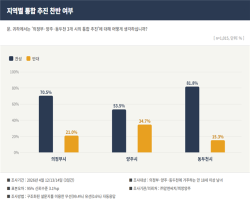 Áö¿ªº°·Î´Â ¿Âµµ Â÷¸¦ º¸¿´´Ù. µ¿µÎõ½Ã°¡ 81.8%·Î °¡Àå ³ôÀº Âù¼º·üÀ» ±â·ÏÇßÀ¸¸ç, ÀÇÁ¤ºÎ½Ã°¡ 70.5%·Î µÚ¸¦ À̾ú´Ù. ¾çÁÖ½ÃÀÇ °æ¿ì Âù¼º 53.5%, ¹Ý´ë 34.7%·Î Âù¼º·üÀÌ °ú¹ÝÀ» ³Ñ¾úÀ¸³ª Ÿ Áö¿ª¿¡ ºñÇØ »ó´ëÀûÀ¸·Î ½ÅÁßÇÑ ÀÔÀåÀ» º¸¿´´Ù.