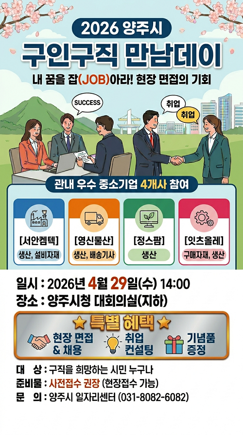 Çà»ç´Â ¿À´Â 4¿ù 29ÀÏ ¿ÀÈÄ 2½ÃºÎÅÍ 4½Ã±îÁö ¾çÁÖ½Ãû ´ëȸÀǽǿ¡¼ ÁøÇàµÇ¸ç, ±¸Á÷ÀÚ´Â »çÀü ½Åû ¶Ç´Â Çà»ç ´çÀÏ ¿ÀÈÄ 1½Ã 30ºÐºÎÅÍ ÇöÀå Á¢¼ö ÈÄ ¸éÁ¢¿¡ Âü¿©ÇÒ ¼ö ÀÖ´Ù. Âü¿©¸¦ Èñ¸ÁÇÏ´Â ±¸Á÷ÀÚ´Â À̷¼ µî Áö¿ø ¼·ù¸¦ ÁöÂüÇØ¾ß ÇÑ´Ù.