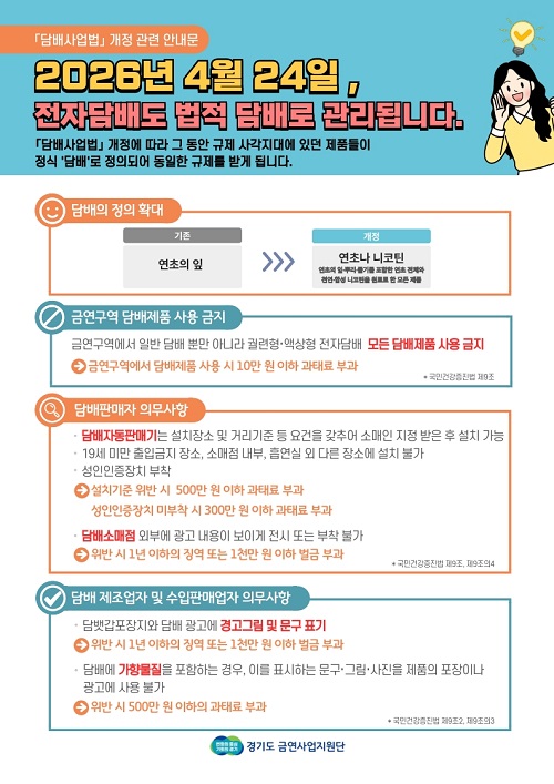 Á¡°Ë ´ë»óÀº '±¹¹Î°Ç°­ÁõÁø¹ý' ¹× '¾çÁֽà Á¶·Ê'¿¡ µû¸¥ ±Ý¿¬±¸¿ª, ´ã¹è ÀÚµ¿ÆÇ¸Å±â, ¼Ò¸ÅÁ¡ ³» ´ã¹è ±¤°í µîÀÌ´Ù. ±¸Ã¼ÀûÀ¸·Î´Â ¡ã±Ý¿¬±¸¿ª·Èí¿¬½Ç ½Ã¼³ ±âÁØ Áؼö ¡ã±Ý¿¬±¸¿ª ³» Èí¿¬ÇàÀ§ ¡ã´ã¹èÀÚµ¿ÆÇ¸Å±â ¼³Ä¡ ±âÁØ Áؼö ¡ã´ã¹è¼Ò¸ÅÁ¡ ³» ´ã¹è ±¤°í ±ÔÁ¤ Áؼö ¿©ºÎ µîÀ» ÁýÁß È®ÀÎÇÑ´Ù. ½ÅÁ¾ ´ã¹è Á¦Ç°¿¡ ´ëÇÑ °ü¸®·°¨µ¶µµ °­È­µÇ¸ç, ±Ý¿¬±¸¿ª ³» Èí¿¬ÀÌ Àû¹ßµÇ¸é ÇöÀå¿¡¼­ Áï½Ã Á¶Ä¡°¡ ÀÌ·ç¾îÁø´Ù.
