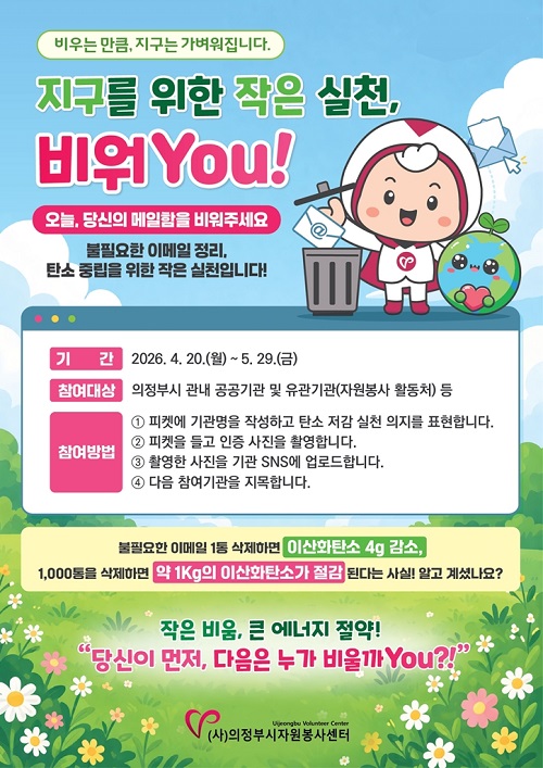 ÀÇÁ¤ºÎ½ÃÀÚ¿øºÀ»ç¼¾ÅÍ´Â ÀÚ¿ø¾Èº¸ À§±â °æ°è ´Ü°è ¹ß·É¿¡ µû¸¥ ¿¡³ÊÁö Àý¾à Á¤Ã¥¿¡ ¸ÂÃç Áö³­ 4¿ù 20ÀϺÎÅÍ Åº¼Ò Àú°¨ ½ÇõÀ» À§ÇÑ ‘Áö±¸¸¦ À§ÇÑ ÀÛÀº ½Çõ, ºñ¿öyou’ ¸±·¹ÀÌ Ä·ÆäÀÎÀ» ½ÃÀÛÇß´Ù.